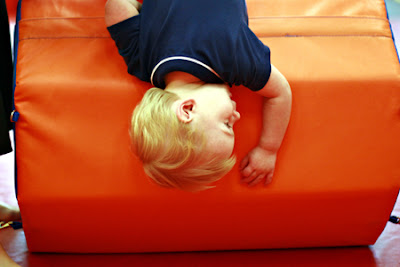 He did really well. He still likes to be the first one to do things. And when they call us into class, he's the last one to go in b/c he is motioning for the other kids to "come on!" Miss Gina thought that was hysterical! They worked on jumping, and body parts, somersaults and hanging from the bar. Jackson freaking LOVES the balance beam--the kid would not walk away from it! He also enjoyed just laying and hanging out in the donut--go figure! Here are some shots from our 45 minute class--it's hard to shoot him AND lead him at the same time, so maybe next week when Daddy goes I'll get some better shots!!